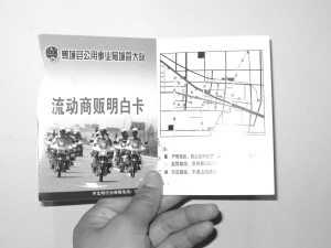 ??? 本報(bào)訊??“有了明白卡,知道在哪條路可以經(jīng)營(yíng),俺再也不用擔(dān)驚受怕地與城管捉迷藏了。”12月2日,鄲城縣公用事業(yè)局向全縣2000多個(gè)流動(dòng)商販每人發(fā)放一張“流動(dòng)商販明白卡”,卡上清楚地標(biāo)明30多條可以流動(dòng)經(jīng)營(yíng)的街道、兩條嚴(yán)禁經(jīng)營(yíng)的街道和部分限時(shí)經(jīng)營(yíng)的街道,商販一目了然,反應(yīng)良好。