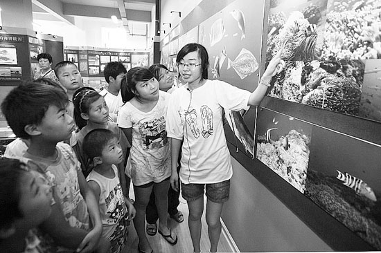 7月9日,來自杭州、金華等地的大學(xué)生志愿者,帶著結(jié)對(duì)幫扶的100多名民工子弟,走進(jìn)海洋科技體驗(yàn)館。胡社友攝(資料圖片)
