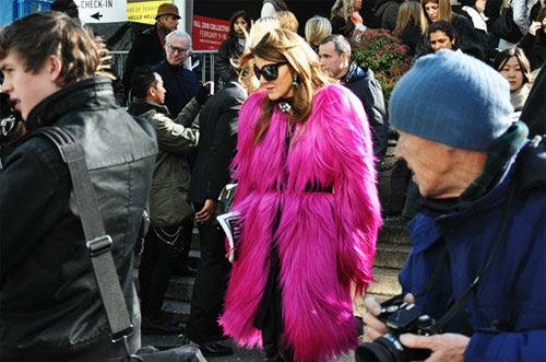 時尚解析:這飄逸和色彩表現(xiàn)到極致的枚紅色長毛外套真是夠搶眼,只求保暖的“愛斯基摩”式只能黯然無光的站在一邊自嘆不如了。如此高調(diào)絢麗的色彩徹底顛覆了人們對皮毛的刻板印象,原來除了暖黃色,深冷色,還可以如此華麗麗。再配以黑超,搭上黑色腰封,經(jīng)典的黑色打底褲,看,花甲老人都被你深深吸引了。