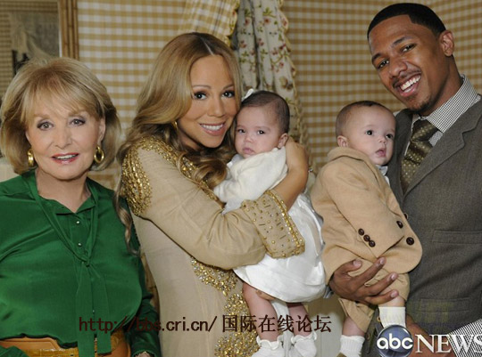 自從瑪利亞·凱利在今年4月產(chǎn)下龍鳳雙胞胎以來就一直盡力躲避公眾的視線。但是凱利的雙胞胎夢露和摩洛哥將迎來首次公開亮相,一家4口近日接受了芭芭拉·沃爾特斯的采訪。此次兩位雙胞胎亮相,粉嫩可愛的小寶寶身穿黃色嬰兒服,從膚色到長相都和爸爸 Nick Cannon極其相似。