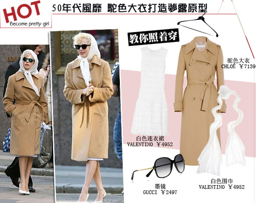 近期大熱的電影《我與夢(mèng)露的一周》中,米歇爾·威廉姆斯(MichelleWilliams)給我們重現(xiàn)了夢(mèng)露的經(jīng)典造型。其中,這套身著脫色外衣、頭戴白圍巾的50年代裝扮讓大家記憶深刻。一件簡(jiǎn)單的駝色大衣,一條圍巾搭配一架墨鏡,露出纖細(xì)小腿配雙小細(xì)跟鞋,如果你也想嘗試下復(fù)古的感覺(jué),那千萬(wàn)不能錯(cuò)過(guò)