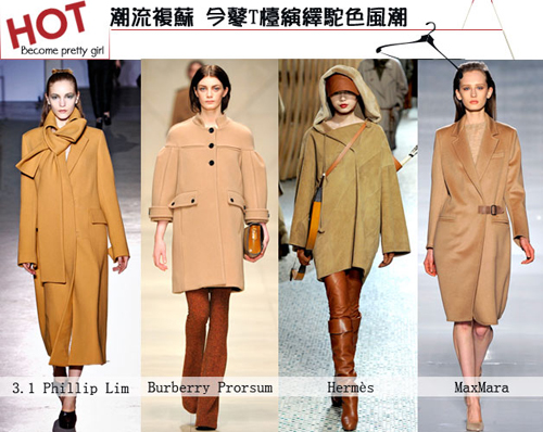 優(yōu)雅、奢華、大氣的大地色調(diào)橫掃各大秀場(chǎng)。Phillip Lin、BurberryProrsum、Hermes、MaxMara等大牌時(shí)裝秀場(chǎng)上我們都看到了駝色大衣的身影。各個(gè)深淺層次不一的駝色系看起來(lái)都是那么的惹人喜愛(ài)