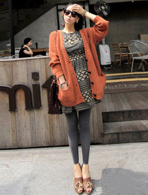 復(fù)古印花的連衣裙搭配深灰色打底褲,顏色上面非常呼應(yīng),民族風(fēng)有沒有!橘色復(fù)古毛衣當(dāng)做外套,流蘇坡跟鞋子也散發(fā)古著氣息,深棕色手袋的搭配也恰到好處