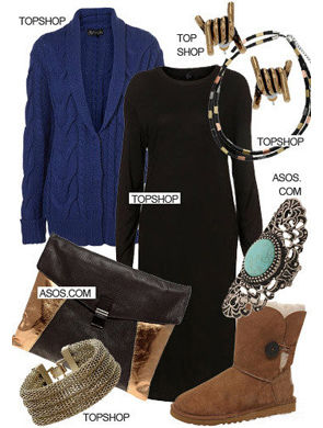 復(fù)古編制翻領(lǐng)毛衣TOPSHOP;黑色針織長(zhǎng)裙 TOPSHOP、雪地靴 UGG、金屬扣拼色手包 ASOS.COM、金屬手環(huán) TOPSHOP、做就金屬耳 TOPSHOP、拼色雙環(huán)項(xiàng)鏈 TOPSHOP、人造石金屬鏤空戒指 ASOS.COM
