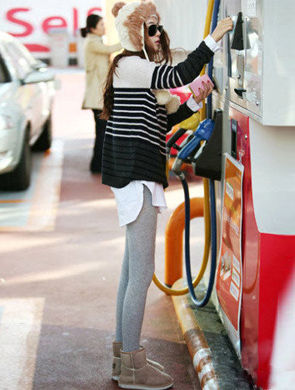 毛衣+打底褲 經(jīng)典條紋套頭毛衣+白色中長(zhǎng)款長(zhǎng)袖T恤,煙灰色打底褲搭配雪地靴很干凈清爽,雷鋒帽在顏色上和材質(zhì)上都和雪地靴上下呼應(yīng),韓范兒的MM學(xué)習(xí)起來 ?