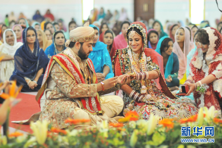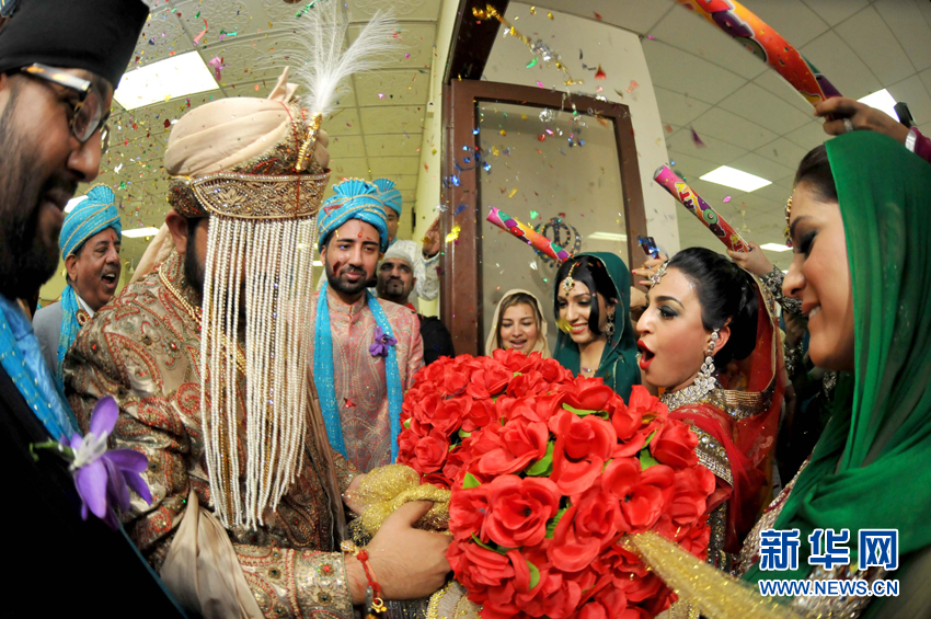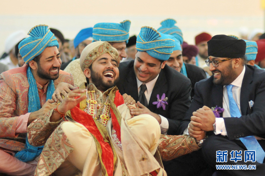 ????11月27日,在馬來西亞吉隆坡的一座錫克廟舉行的婚禮上,新郎接受朋友的祝賀。當(dāng)天在吉隆坡的一所馬來西亞最大的錫克廟中,一對錫克族新人舉行一場傳統(tǒng)的婚禮。新郎家人抵達錫克廟宇前即大展舞蹈歡慶?;槎Y儀式前,新郎需要經(jīng)過新娘的姐妹團的考驗方能夠進入禮堂。新娘抵達后,在錫克廟宇住持的主持下舉行錫克宗教儀式,儀式中新娘和新郎接受雙方父母的絲帶后繞圈而行。最后新人互相為對方帶上婚戒,在住持祝福下完成一場錫克傳統(tǒng)的婚禮。新華社發(fā)(張紋綜攝)