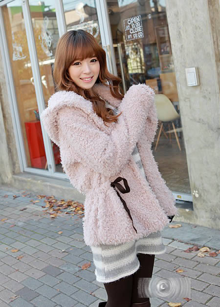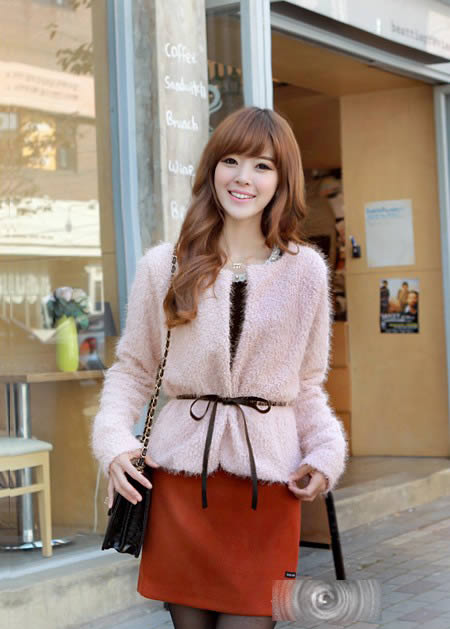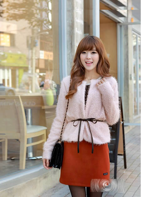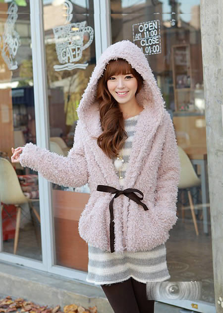 羊羔毛材質(zhì),簡約收腰外套。粉色系襯托出可愛甜美氣息。黑色的緞帶腰帶打成蝴蝶結(jié),更顯可愛。溫暖又時髦