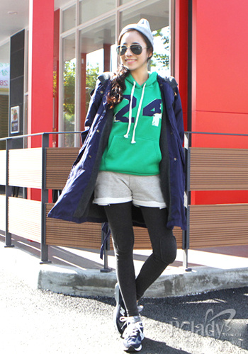運動的內(nèi)抓絨材質(zhì)是韓國MM的最愛!亮綠色數(shù)字帶帽套頭衛(wèi)衫+煙灰色卷邊抓絨短褲,補丁打底褲是今年的熱款,深藍色運動鞋和棉衣搭配。學(xué)生氣息中不失時尚度