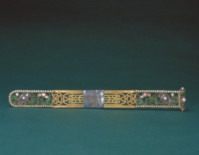 清代宮廷后妃們的首飾由廣儲司和造辦處的撒花作、累絲作、玉作、牙作、鑲嵌作、琺瑯作等處承做。這些宮廷首飾造型高貴典雅,做工細致入微,所用金銀珠寶的數(shù)量之巨難以數(shù)計。同樣,這些首飾中間也體現(xiàn)了嚴格的等級制度。