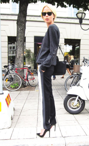 當(dāng)然,沒有上衣那么復(fù)雜,褲子的拼接,更多有點像Side Stripe Pants,就是那種褲邊有裝飾條紋的運動褲或者制服褲,充滿了簡約的中性風(fēng),搭配起來也很容易,高跟鞋或者牛津鞋都很搭調(diào)。你可以想象到,這樣的褲子,能夠充分修飾腿形,拉長拉長再拉長,視覺上也會覺得非常纖細(xì)。這樣一想,各位是不是馬上蠢蠢欲動?