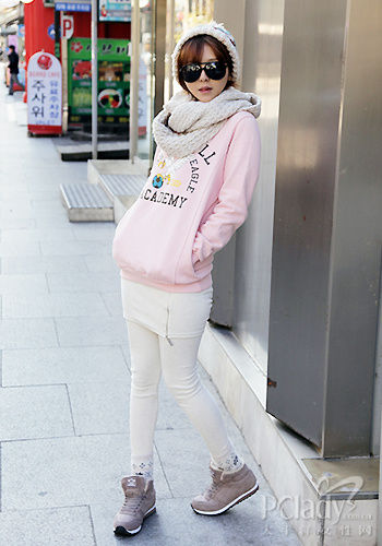 套頭抓絨衛(wèi)衣+白色打底褲 清純甜美