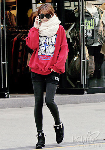 玫紅色長(zhǎng)款套頭衛(wèi)衣穿在皮膚白皙的小白MM身上,將臉色映襯得格外紅潤(rùn)又精神,黑色瘦腿褲的出現(xiàn)提升了整體摩登效果的作用。