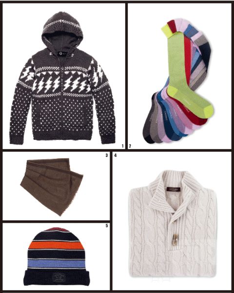 1.深灰色圖紋毛衣AGNES B. 2.條紋棉襪CANALI 3.咖啡色圍巾PAUL&SHARK 4.白色鏈條針織毛衣CANALI 5.撞色針織帽 PAUL&SHARK