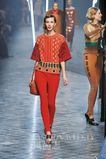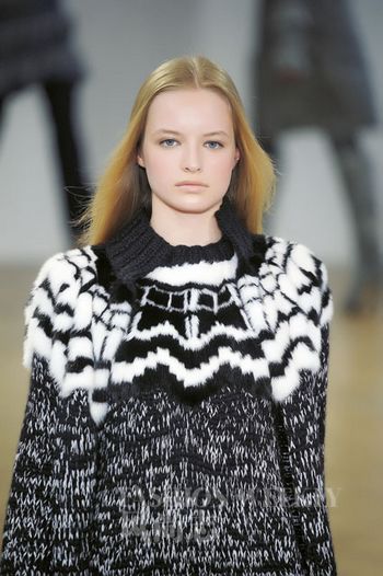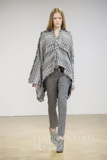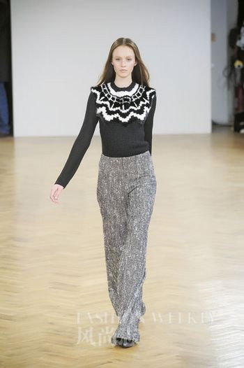 雪花紋樣的時髦說法是“雪柄”,有心人考證這說法來自東瀛,途徑香港,最終來到內地。像手工制品被稱作“手作”一樣,四字變兩字不只是簡潔,中間更蘊含了清新活潑的意味。一個柄字,容易讓人想到滑雪者的手杖。蹬滑雪板持手杖的小人形象,確實經(jīng)常與雪花紋樣結伴出現(xiàn)。2010年D&G推出的秋冬系列即是以雪花為靈感的針織滑雪裝,這些帶雪花紋樣的緊身衣與雪紡長裙還有滑雪靴的組合,堪稱經(jīng)典。今年Aubin?&?Wills在圣誕期間推出的毛線開衫、手套和帽子,皆有滑雪小人與雪花的組合。Jil Sander則更抽象一些,模特大多穿帶有風帽的滑雪裝,顏色鮮艷,還有六角紋出現(xiàn)在大紅毛衫上,好像經(jīng)過畢加索思考后的雪花