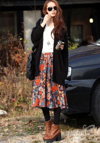 白色小V領(lǐng)打底內(nèi)扎在橘色花裙中,露出的鎖骨展示自己的小性感,黑色毛毛外套長度適中,即有小女人的穩(wěn)重也不會壓掉裙子帶來的甜美活潑感。