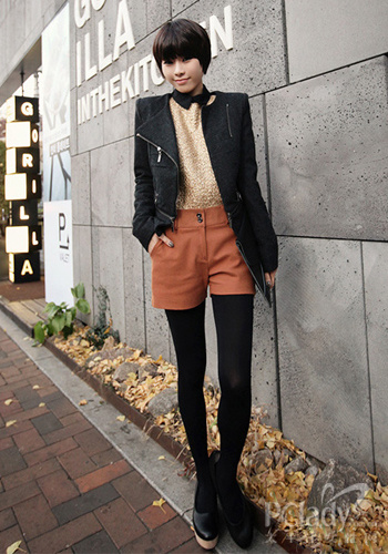 有些帥氣的小女人是男生格外傾心的一種:小尖領(lǐng)的金色內(nèi)搭復(fù)古搭配橘色高腰短褲,黑色機(jī)車款聳肩外套帥氣加入,整體視覺感非常高挑,信封手包+松糕鞋,都是潮品!