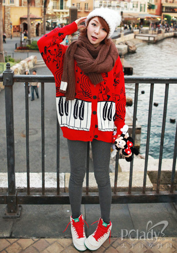 紅色復(fù)古鋼琴毛衣外套相當(dāng)亮眼,深灰色補(bǔ)丁打底褲是當(dāng)季熱門單品,白色高幫板鞋有了紅色鞋帶的搭配巧妙和毛衣呼應(yīng),圍巾則選擇了鐵紅色,能遮蓋一些毛衣的刺眼緩和整體色調(diào)。