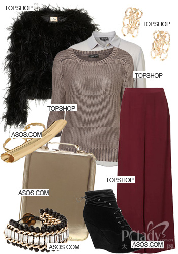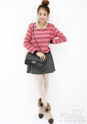 粉色必然是約會最佳選擇,條紋拼色的毛衣里面搭配了裸色復(fù)古圓領(lǐng)襯衫,搭配上灰色短裙,包包頭的發(fā)型襯托下可愛度馬上提升,皮草裝飾的短靴和襯衫呼應(yīng),鏈條包包斜跨也是很不錯的搭配。