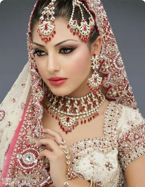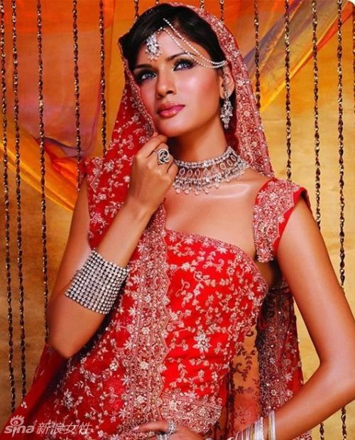 印度新娘首飾種類繁多,有耳環(huán)、項鏈、戒指、手鏈、手鐲、發(fā)飾、額飾、胸飾、腳鏈等?;槎Y慶典是婦女展示首飾的最佳時刻。佩戴多少首飾,是婆家衡量新娘嫁妝是否豐厚的重要標準