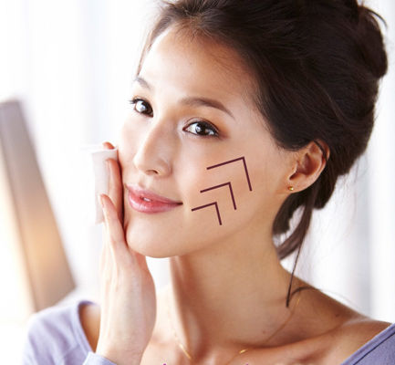 將化妝棉沾濕,動(dòng)作放慢,沿著臉部輪廓線由下而上拍打,以全臉拍100下為目標(biāo):兩頰、額頭、鼻子各25下。