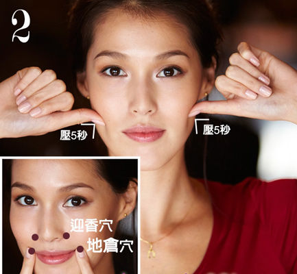 以拇指按壓顴骨下方凹陷處,數(shù)5秒后放開(kāi),重復(fù)3次,促進(jìn)臉部血液循環(huán)。也可以食指按壓鼻翼及嘴角穴道,加碼活絡(luò)血循