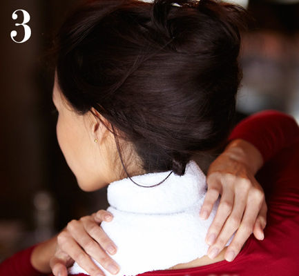 熱毛巾沾濕擰干,熱度不要太高,約比體溫高極可(約40℃),圍在後頸部,向前延伸至鎖骨處,搭配深呼吸3次,放松身心。