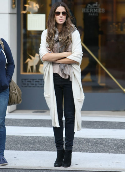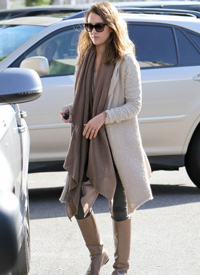 同是長款毛衣外套,下擺不規(guī)則,長長的圍巾置于胸前,下擺與外套有著異曲同工之妙,下半身為小腳褲+高筒靴,冬日顯瘦經(jīng)典搭配,雖然沒有亮眼的色彩,但是整體搭配相當(dāng)拉風(fēng),讓人忍不住回多看一眼