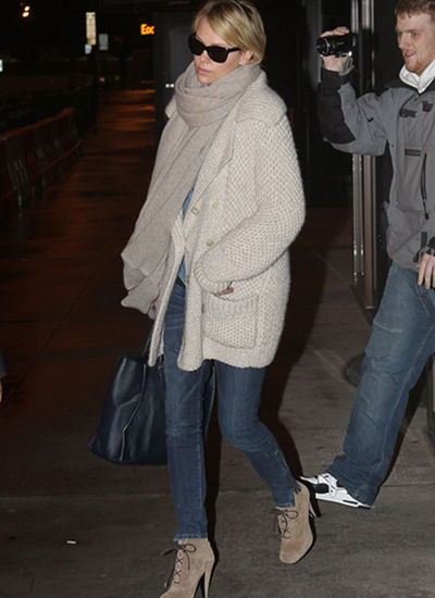 粗棒針毛衣外套,顯得十分厚實。溫暖,加上大大的圍巾,十分有冬天的感覺,拉鏈設(shè)計的小腳褲更有亮點,搭配復(fù)古短靴,時尚中帶著復(fù)古情懷