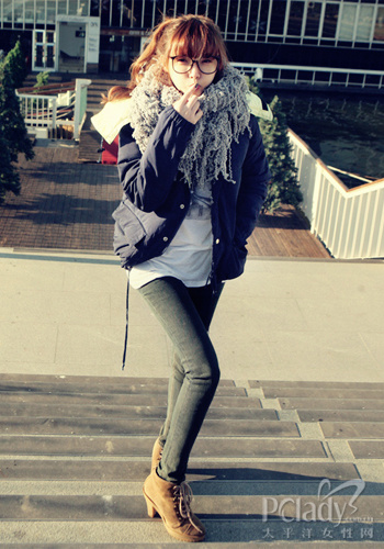 ????3.運動款棉服時髦搭 ????冬天除了正式場合的大衣、保暖的羽絨服,還要不可缺少的就是棉服啦。運動短款更好彌補嬌小身材問題,要知道腿部細節(jié)才是重點。配上針織圍脖小臉效果非常明顯