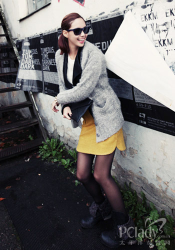 灰色毛衣、針織內(nèi)搭、白色T恤和英倫小跟鞋,整體搭配的亮點(diǎn)在于姜黃色短裙的搶眼色調(diào),還有夸張巴洛克風(fēng)手鐲的點(diǎn)綴,休閑隨意的歐美系搭配