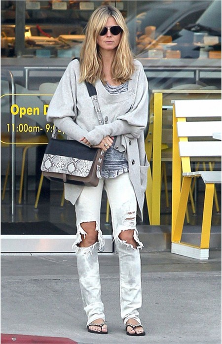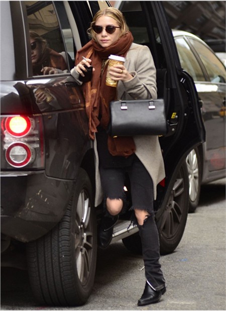 時尚解析:大大的破洞,膝蓋都跑出來了,然而上身則是大衣和大圍巾,小腳部分還有拉鏈設(shè)計,搭配男性化的皮鞋,超級有范兒