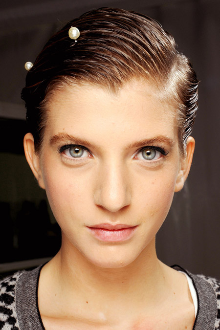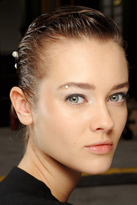 ??? 香奈兒 (Chanel) 2012春夏巴黎時裝周秀場上,彩妝師Peter Philips 把妝容重點放在光澤上,體現(xiàn)出唯美純凈和淡淡的奢華,與裝點的施華洛世奇半圓形珍珠相映生輝。他用白皙又有光澤的底妝配上了粉色珊瑚色的腮紅,濕潤并微閃光澤的眼影,最后以黑色的眼線收尾。嘴唇上也帶著微微的珠光,最亮的只有粉色唇彩和被貼在模特的眉毛、耳朵和鼻側,或者濕潤的頭發(fā)上的白色珍珠。