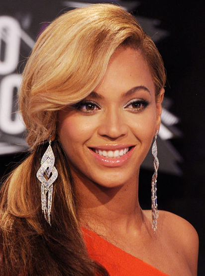 Beyoncé性感側(cè)馬尾:在頭發(fā)完全吹干前先抹一些輕盈造型膏,然后用圓梳稍微卷曲發(fā)尾。將頭發(fā)側(cè)分后,用32mm的卷發(fā)棒卷好頭發(fā),然后用豬鬃毛發(fā)梳數(shù)開發(fā)卷。S型劉海需要用梳子、手和定型噴霧來打造,噴上噴霧以后,用手將劉海窩成想要的S型,固定一會后松開。再用皮筋或者發(fā)帶在一側(cè)綁好馬尾就搞定了