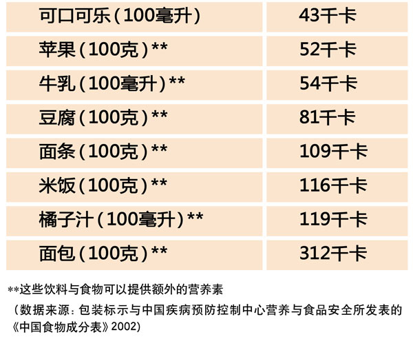 因此,合理的糖分?jǐn)z入,比如下午茶的幾塊甜點(diǎn)或是運(yùn)動(dòng)后一杯冰爽的汽水并不可怕。只要維持?jǐn)z入與消耗的能量平衡就可以有效地控制體重與體形。根據(jù)可口可樂包裝標(biāo)識(shí)與中國疾病預(yù)防控制中心營養(yǎng)與食品安全所發(fā)表的《中國食物成分表》可發(fā)現(xiàn),相同容量的可樂所含的能量其實(shí)比蘋果還要低。我們來看一下可樂和其他飲料及食物能量的對比: