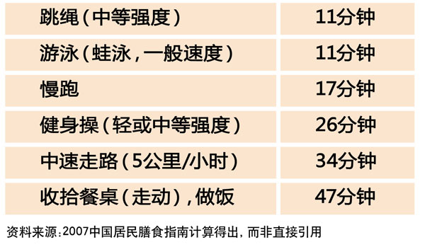 美國肥胖防治的權(quán)威專家,曾任美國國家衛(wèi)生署預(yù)防及治療肥胖特遣小組成員的約翰·弗爾特教授說:肥胖與否的關(guān)鍵是在于我們攝入能量總量和通過運(yùn)動(dòng)消耗的能量總量是否平衡所決定的。保持體重最簡單的辦法就是:吃動(dòng)平衡,通過運(yùn)動(dòng)將攝入的能量消耗出去。一個(gè)70公斤左右的成年人,中速走路34分鐘,或是花11分鐘跳繩或者中速蛙泳,即可消耗掉大約一罐330毫升可口可樂的能量。