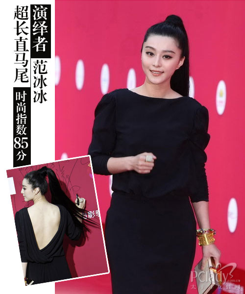 演繹心機(jī):范冰冰這款帥氣的馬尾充滿了獨(dú)屬于東方神秘的美感,柔順黑亮的秀發(fā)是最好的裝飾。高聳的馬尾綁緊后將一部分頭發(fā)纏在馬尾根部,走動起來頗有幾分俠女的風(fēng)范??上н@款發(fā)型實(shí)在是太挑人了,不僅要求臉型夠小,而且五官也要足夠出挑才能駕馭,雖然效果確實(shí)很好,但是鑒于普及度不高,只能停留在85分的時(shí)尚指數(shù)了