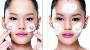 1.潔面慕斯起泡后,用手掌分別像斜上方按摩額頭;