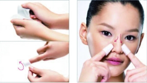 2.鼻子上預先滯留黑頭導出液,看到黑頭浮出后用纏有化妝棉的手指由上至下輕輕“刮除”黑頭;