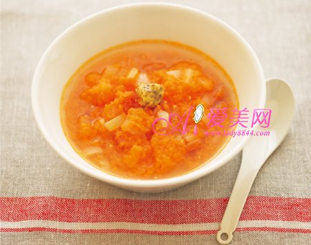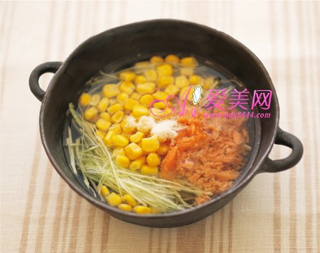 材料:罐頭鮭魚2勺、玉米粒30克、椰菜葉1片、喼汁1茶匙、鹽1/4茶匙、水200毫升。