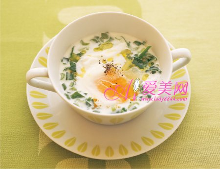 材料:小松菜30克、生雞蛋1個、鹽1/3茶匙、牛奶200毫升、橄欖油少許、醬油少許。
