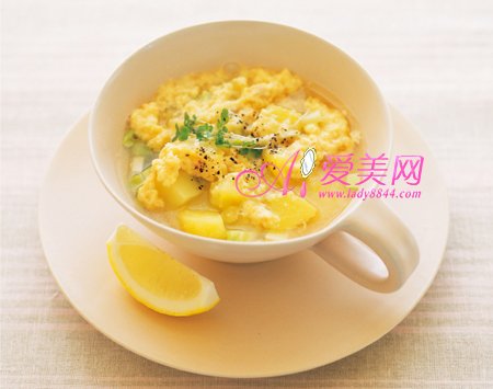 材料:西蘭花40克、土豆1個、生雞蛋1個、味噌1勺、芝士粉1茶匙、檸檬少許、水200毫升。