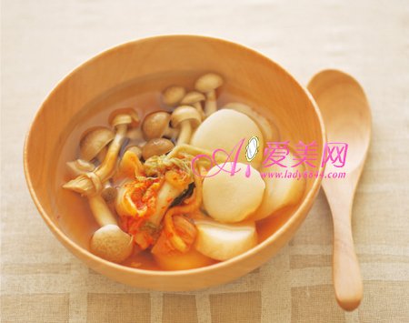 材料:叢生口蘑30克、泡菜30克、面筋5個、鹽少許、胡椒粉少許,水200毫升。