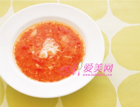 材料:紅甜椒50克、生姜少許、京蔥少許、金槍魚罐頭半罐、鹽1/3茶匙、胡椒粉少許、藕粉1勺、辣油少許、水200毫升。