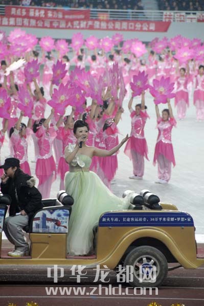當(dāng)日16時(shí)30分許,伴隨著悠揚(yáng)的鐘聲,文體表演第一章“龍騰歡歌”拉開(kāi)序幕,幾百名身著盛裝,手拿花環(huán)、紅綢的演員從4個(gè)方向快速向市體育場(chǎng)中心表演場(chǎng)地飛奔而去,在音樂(lè)聲中盡情舞蹈。表演隊(duì)伍中最吸引觀眾眼球的是一群身穿泥泥狗造型服裝的演員,他們獨(dú)特的表演十分引人注目。同樣出現(xiàn)在演出現(xiàn)場(chǎng)的還有擔(dān)經(jīng)挑、旱船、竹馬等反映周口獨(dú)特文化資源的文化元素,這些無(wú)疑成了第一章的最大亮點(diǎn)。