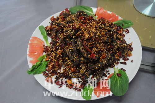 ????到了孫店鎮(zhèn),不吃“干煸盤龍鱔”是種遺憾。這里的“干煸盤龍鱔”不僅選料考究,而且做工精細。鱔魚必須選擇顏色呈黑褐色的天然生黃鱔,辣椒以紅色為宜。做法要經(jīng)過泡、燙、炸、煸炒等工序。“干煸盤龍鱔”具有極高的營養(yǎng)價值和藥膳作用?!袄倍荒?、麻而可口!”記者品嘗了剛做好的“干煸盤龍鱔”,發(fā)現(xiàn)風味果真獨特。
