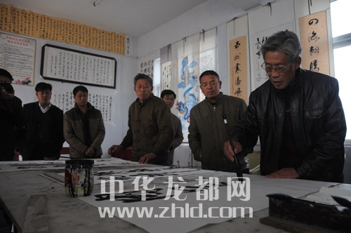 ????作為距離太康縣城最遠(yuǎn)的一個(gè)邊界鄉(xiāng)鎮(zhèn),轉(zhuǎn)樓鄉(xiāng)的文化活動(dòng)開展得有聲有色。該鄉(xiāng)依托文化站,成立了在鄉(xiāng)一級(jí)少見的文聯(lián),下設(shè)書法家協(xié)會(huì)、腰鼓協(xié)會(huì)、嗩吶協(xié)會(huì)等。我們?cè)谵D(zhuǎn)樓鄉(xiāng)政府采訪時(shí),正碰上書法家協(xié)會(huì)20多名會(huì)員在一起切磋書藝。今年74歲的許家榮是鄉(xiāng)書法家協(xié)會(huì)主席,也是《周口晚報(bào)》的老讀者,看到我們到來,老人興之所至,當(dāng)場(chǎng)揮毫潑墨,為本報(bào)題寫了“周口邊界行接地氣有人氣”的條幅。據(jù)了解,每逢春節(jié),書法家協(xié)會(huì)會(huì)員都會(huì)走村串戶,為村民義務(wù)書寫春聯(lián)。