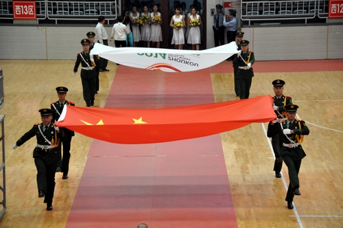 國旗、會(huì)旗方陣經(jīng)過主席臺。
