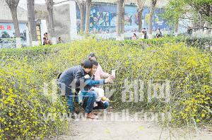 市民在迎春花叢中拍照留念