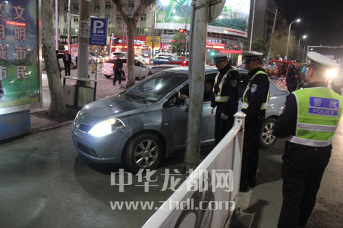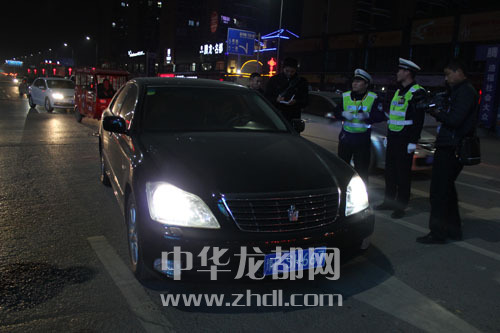 ????圖為交警查處在市區(qū)亂用遠(yuǎn)光燈的車輛