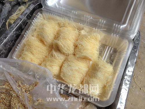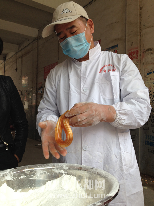 ????伸手從80℃的糖鍋里抓出一塊糖稀,立即就像做拉面一樣反復(fù)拉扯,直至細(xì)如發(fā)絲,然后用剪刀剪斷,用手團(tuán)成一團(tuán),再包上一小撮脫皮芝麻,一團(tuán)龍須酥糖就做好了。